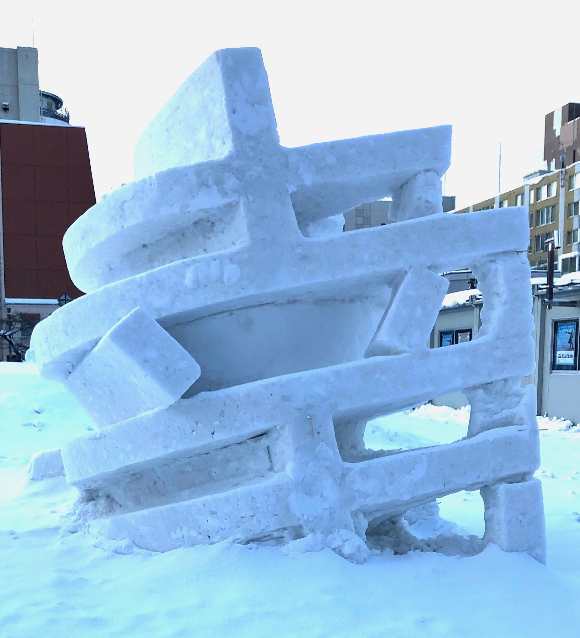 3位のかたち〜朝、仕事場に行くときに大通公園を通ります。近頃は国際雪像コンクールの雪像を毎日みていた。私としては写真のリトアニアが1位。結果は3位。派手さはない。でも緻密な作りと、はかない雪で日本語の「幸」の漢字を素材に、幸せのバランスを表現するのは良かったなぁ。